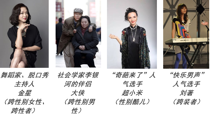 在中国现代社会中,有一些跨儿为人们所熟悉。例如舞蹈家和脱口秀主持人金星 (跨性别女性、跨性者)、社会学家李银河的伴侣大侠 (跨性别男性)、“奇葩来了”人气选手超小米 (性别酷儿)、“快乐男声”人气选手刘著 (跨装者)等等。