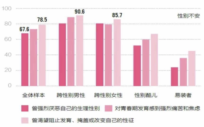无法获得激素治疗导致高风险行为 :调查显示,在无法获得安全、有效的激素治疗的情况下,很多有激素治疗需求的跨儿会因此感到抑郁、焦虑,甚至出现自杀、自残的念头或出现过自杀、自残的行为。有的跨儿会采取非正规途径获得药物,会使用国外不认识名字的药和别人给的不了解的药,会加大用药剂量,甚至有人会使用动物药物或尝试自行切除生殖器官。