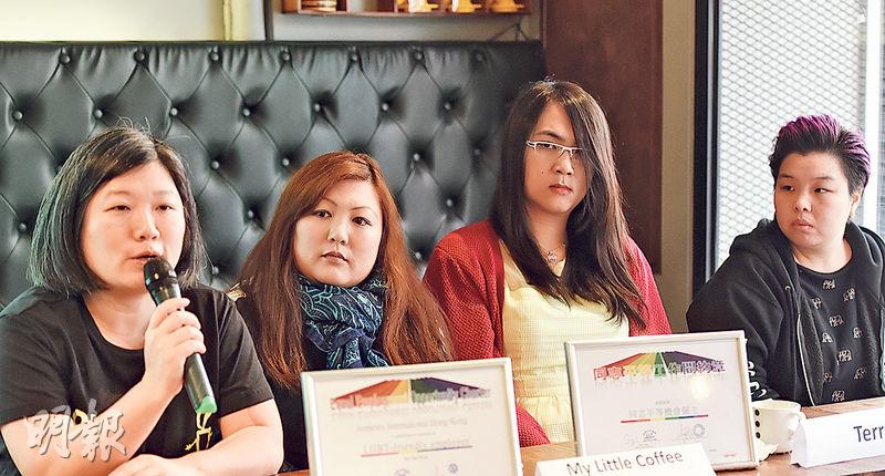 調查發現僅一成同志受訪者會公開性傾向,從事室內設計工作的許偉峰(Terry,右二)是跨性別人士,曾嘗試穿女裝上班,被同事投訴「咁著好難溝通」。(陳淑安攝)