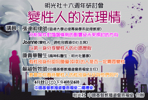日前明光社與中國基督教播道會恩福堂合辦了一個名為《變性人的法理情》的研討會,四位嘉賓分別以法律、心理學、情理、宗教等不同觀點,以上月W爭取婚姻權勝訴一案為起點,討論跨性別人士所面對的問題及其出路。